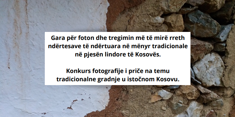 GAIA raspisuje konkurs za fotografije i priče vezane uz tradicionalno izgrađene kuće i/objekate u istočnom delu Kosova. Ove godine počinjemo sa mapiranjem tradicionalnih kuća koje postoje i želimo prikupiti informacije o tehnikama, materijalima i procesu izgradnje, te priče vezane uz njihovu izgradnju. Tehnike tradicionalne gradnje su kulturno nasleđe koje Kosovo čini bogatim, a ovaj konkurs se fokusira na istočni dio Kosova zbog specifičnosti arhitekture.