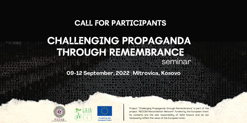 The seminar “Challenging Propaganda through Remembrance” is organized by GAIA Kosovo, more specifically by its program in Mitrovica and is financially supported by RECOM Reconciliation Network. GAIA is a peace organization working in the field of peacebuilding, solidarity between people, social justice and environmental protection. GAIA is also promoting cultural diversity and works on education and integration of marginalized and minority groups in society, especially Roma, Ashkali and Egyptians. GAIA is the official branch of Service Civil International in Kosovo.